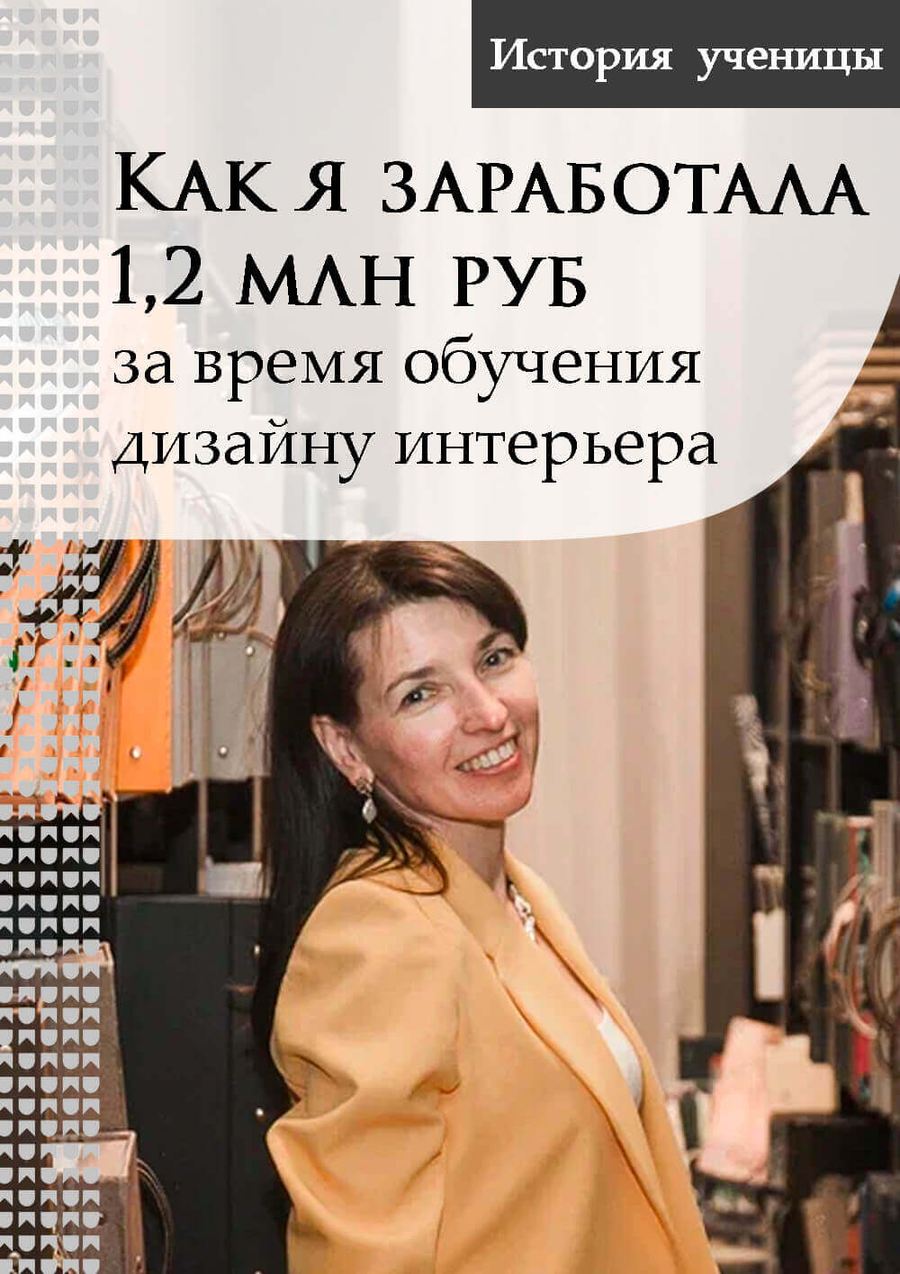 Я была успешным руководителем отдела продаж телемаркетинга. В целом меня всё устраивало, но работа меня изнуряла. А когда мне исполнилось 40 лет, я решила наконец-то найти дело для души, которому смогу посвятить всю жизнь. И это стал дизайн интерьера, ведь я всегда обожала ремонт, часто все переделывала и переклеивала.